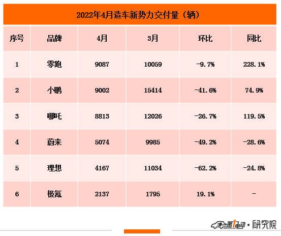 4月新势力榜:零跑首夺冠 理想下降至第五